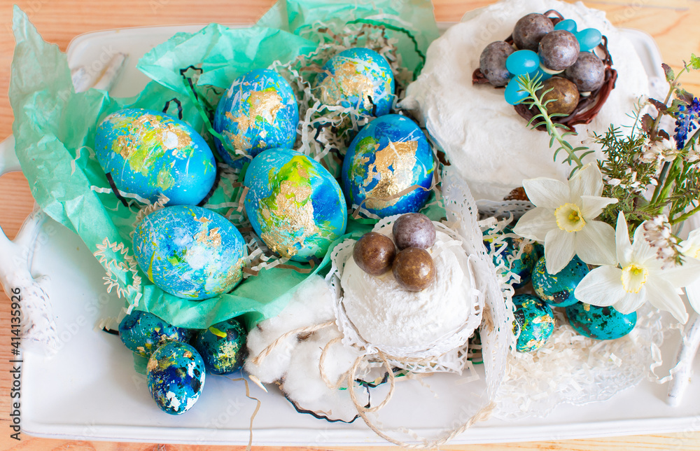 Still life Easter chicken eggs and quail eggs in a nest, cake decorated with chocolate and daffodils. Easter vacation concept