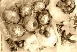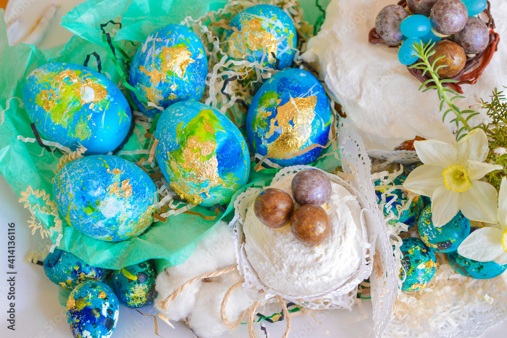 Still life Easter chicken eggs and quail eggs in a nest, cake decorated with chocolate and daffodils. Easter vacation concept