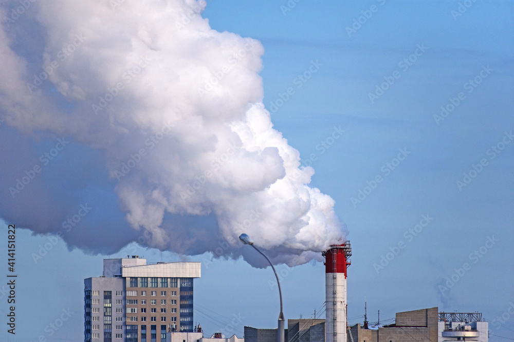 White smoke erupts from the chimney of the city's gas heating boiler house against the blue winter sky