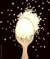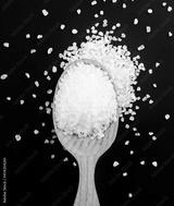 Salt crystals in a wooden spoon on a black background. Top view