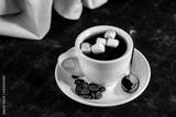 White cup of coffee on a saucer with coffee beans and marshmallows. Espresso. Close-up.