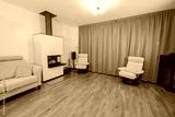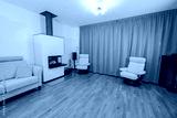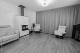 Beautiful view of interior of modern living room. White fireplace, light colored furniture on white wall background.