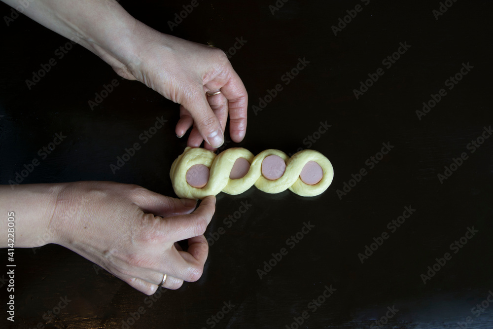 Image of the process of cooking sausage in the dough, wrap a piece of sausage in the dough