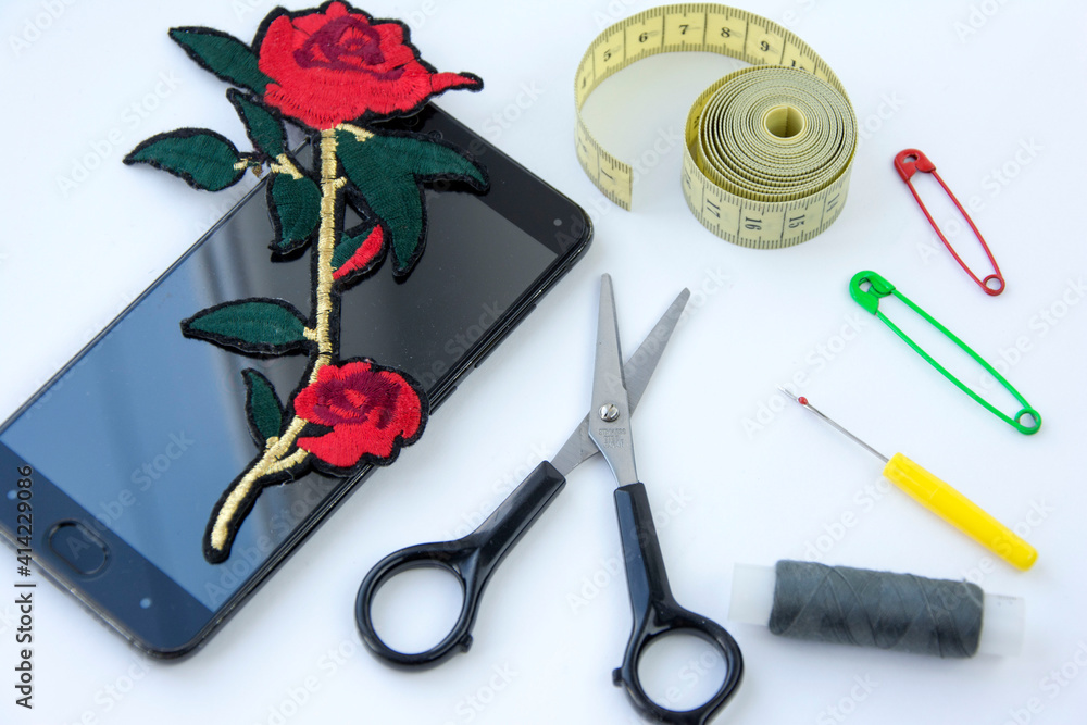 sewing set for decor, homemade needlework, scissors, threads, bulls, smartphones rose for application