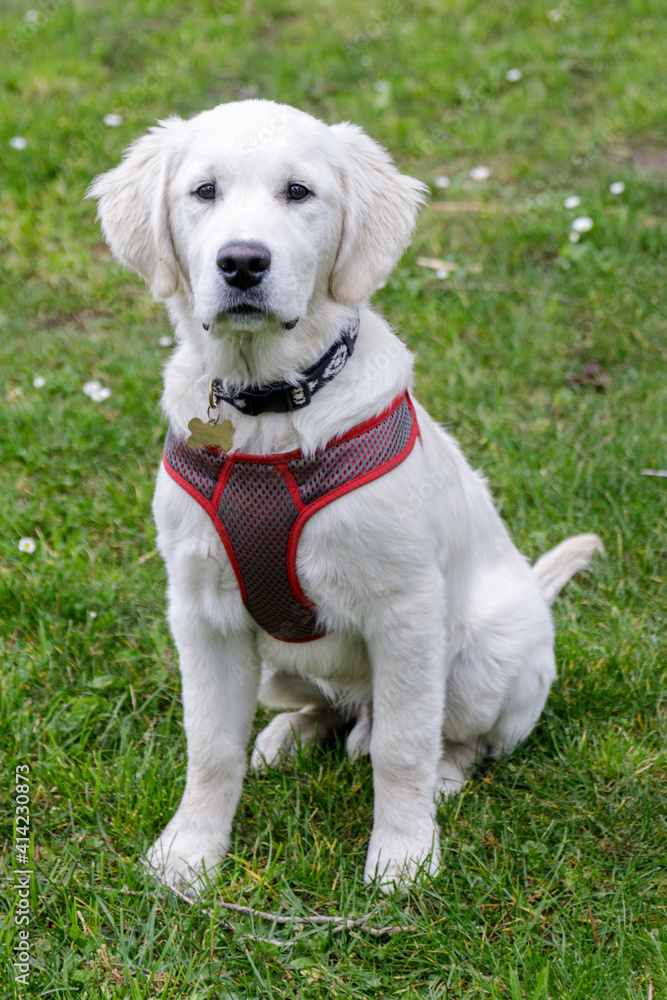 5-Months-Old White Labrador Retriever Puppy Male. Off-leash dog park in Northern California.