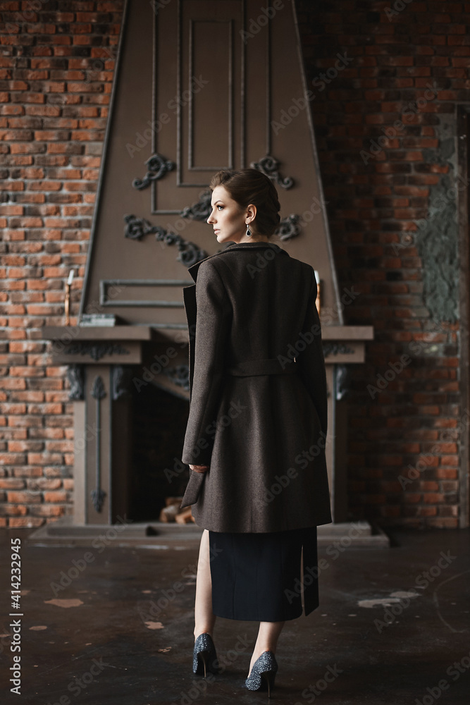 Beautiful model woman with slim body in fashionable coat posing in the vintage interior