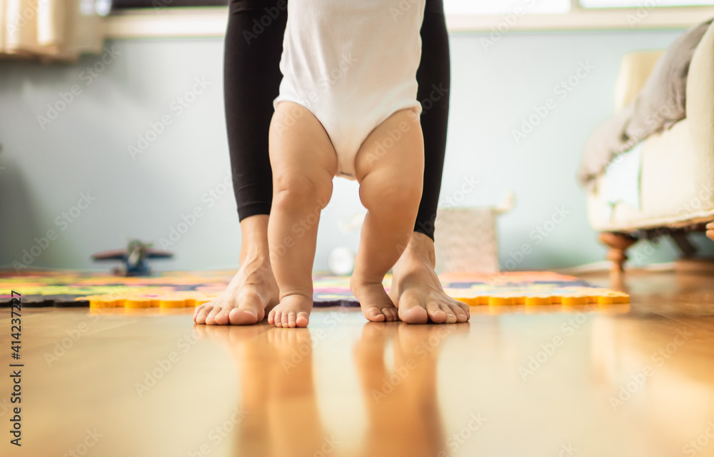 Baby learning to walk with the help of mother. Baby's first steps concept.