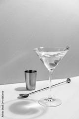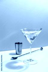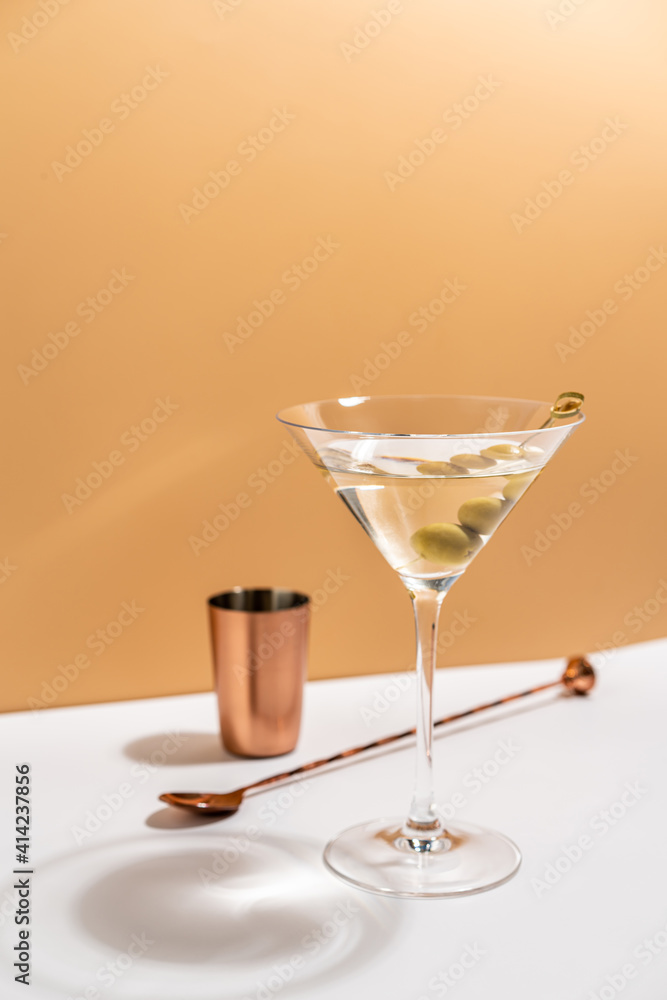 Cocktail vodka martini with green olives on orange background with bright beautiful shadows