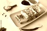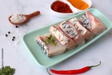 Uncooked boneless pieces of threadfin fish. Raw Dadha fish cubes placed on a blue plate. clean fish fillets with skin on. Recipe ingredients such as rock salt, coriander, and spices. Copy space.