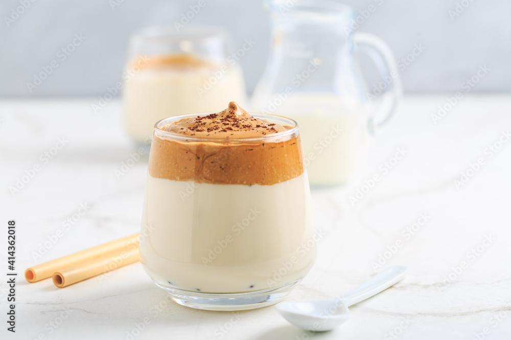 Dalgona coffee. Iced fluffy creamy whipped trend drink with coffee foam and milk