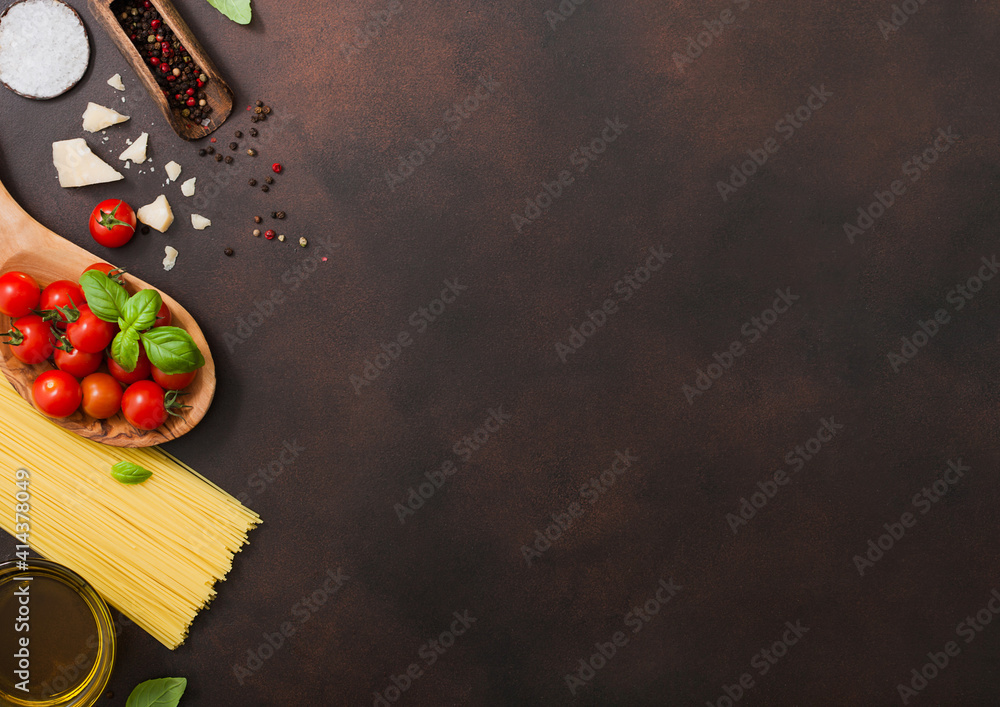 Spaghetti with cherry tomatoes in wooden bowl with pepper in scoop and parmesan cheese with salt on dark brown background.