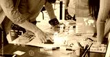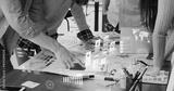 Close up ux developer and ui designer use augmented reality app brainstorming about mobile interface wireframe design on desk at modern office.Creative digital development agency