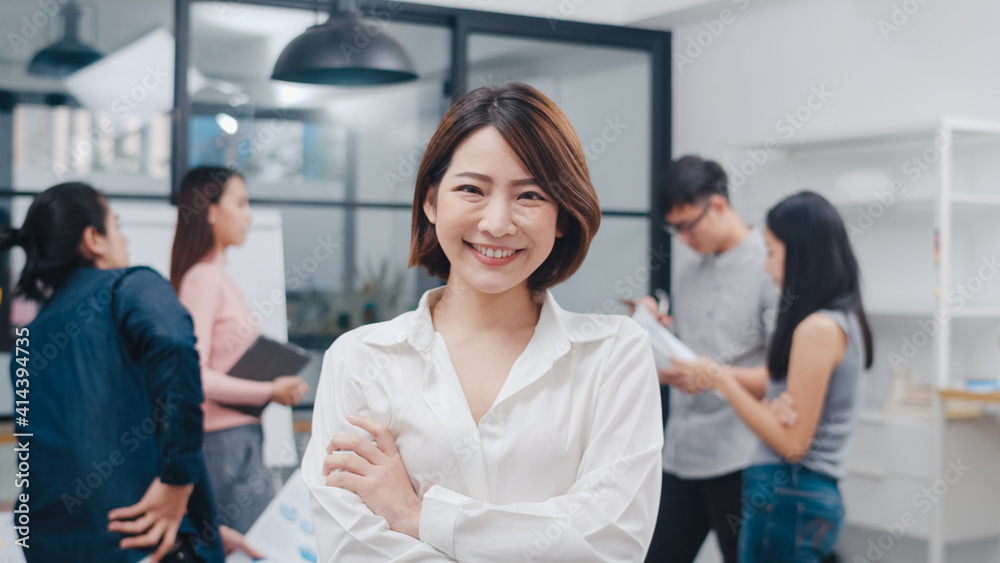 Portrait of successful beautiful executive businesswoman smart casual wear looking at camera and smile, arms crossed in modern office workplace. Young Asia lady standing in contemporary meeting room.