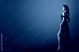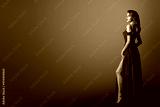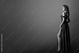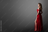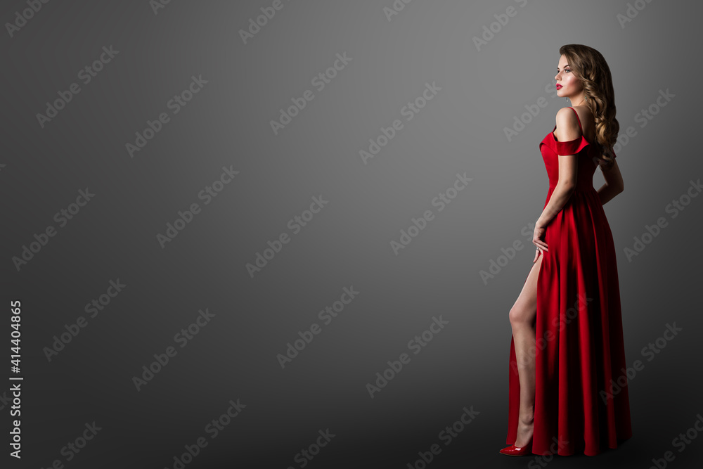 Fashion Woman in Long Red Dress. Model Showing Leg in Evening Silk Slit Gown. Side Profile View. Black Background with Copy Space