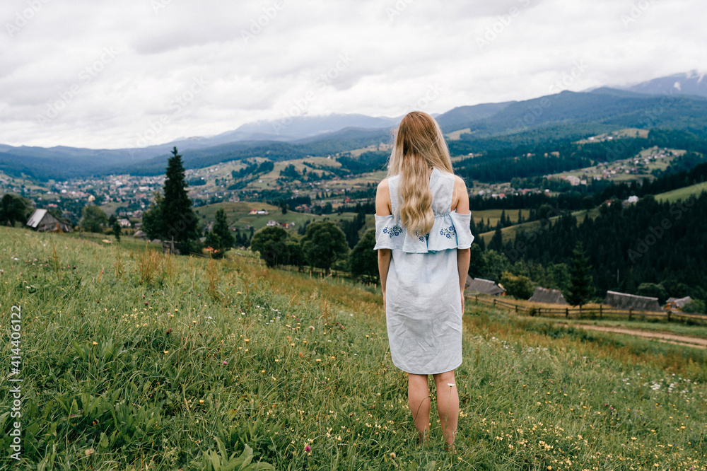 Young attractive elegant blonde girl in blue romantic dress posing back over picturesque landscape