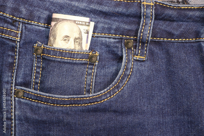 Stack of American hundred dollar bills in a pocket of blue jeans. Money in your pocket, cash.
