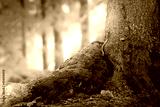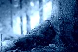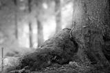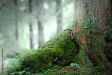 Closeup shot of green moss on stone and tree with a foggy forest background