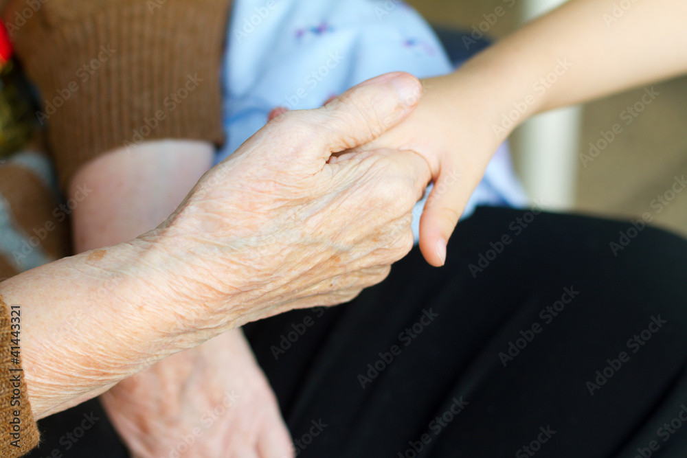 Grandmother holds the hand of his grandson