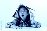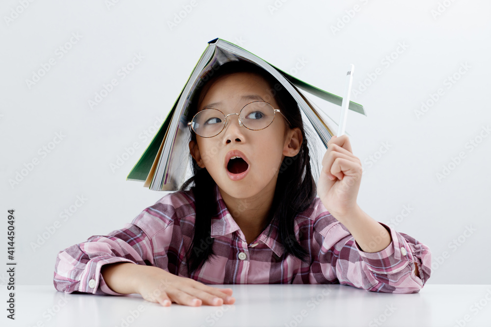 Portrait of a surprise little Asian girl covering head with book on a desk, child having fun, fooling around instead studying lesson. Indoor studio shot isolated on white background.