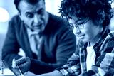 Little learner. Close up portrait of happy little hispanic school boy doing homework together with his father while sitting at the desk at home