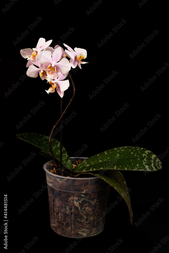 Beautiful curved dotted pink orchid in the pot on dark background
