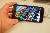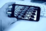 Business technology and stock market concept: A human hand is holding a smart phone. On the screen are colored numbers showing financial graphical up and downs. Trending cryptocurrency and Forex