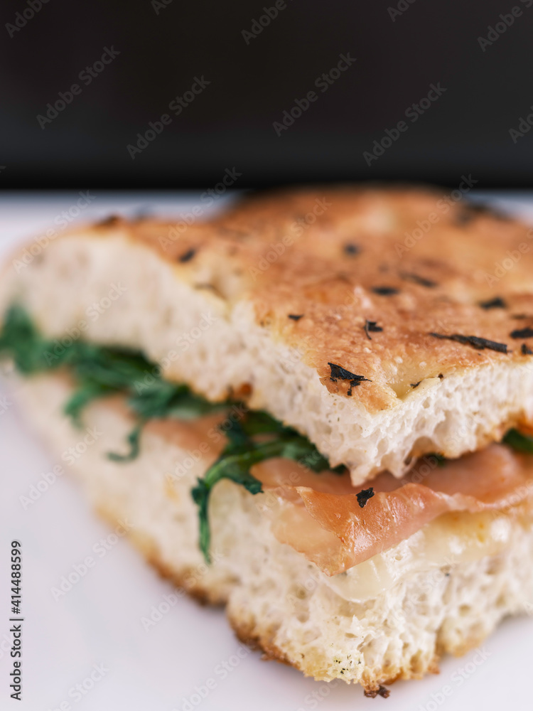Italian Focaccia Sandwich with Prosciutto, Arugila and Cheese
