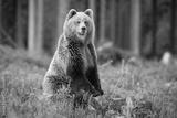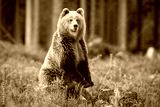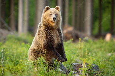 Brown bear, ursus arctos, standing on rear legs upright in forest in summer sun. Large predator looking to the camera on glade in sunlight. Wild mammal staring in wilderness.