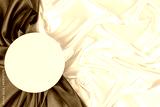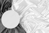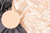 Circle platform podium on elegant black and champagne color background with drapery and wavy folds of silk satin material. Pastel mock up background for cosmetic product presentation. Top view