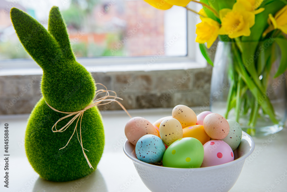White bowl with colored easter eggs, bouquet of yellow tulips and daffodils flowers and green bunny rabbit on white kitchen table near window. Festive Ester spring card. Selective focus. Copy space.