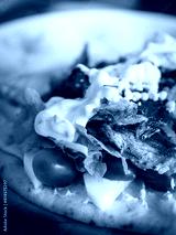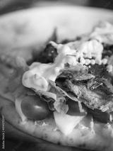 Greek healthy food beef souvlaki with yogurt on top. Healthy eating.