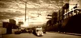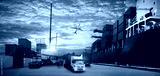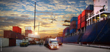 Container truck in ship port for business Logistics and transportation of Container Cargo ship and Cargo plane with working crane bridge in shipyard at sunrise, logistic import export and transport
