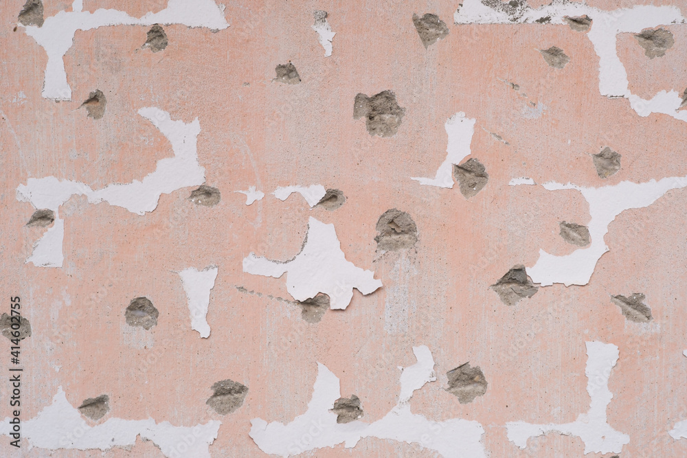 Concrete wall texture is broken and glue plaster stains surface after removing tiles before renovation.