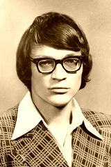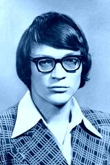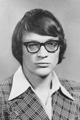 Portrait of young Soviet guy with glasses, in checkered jacket. Vintage black and white paper photo, 1970s. Transferred property, family archive. Outdated quality