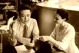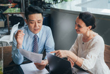 Business colleagues working together. Team of two smiling business people talking and looking at papers. Businessman showing documents to happy businesswoman