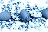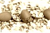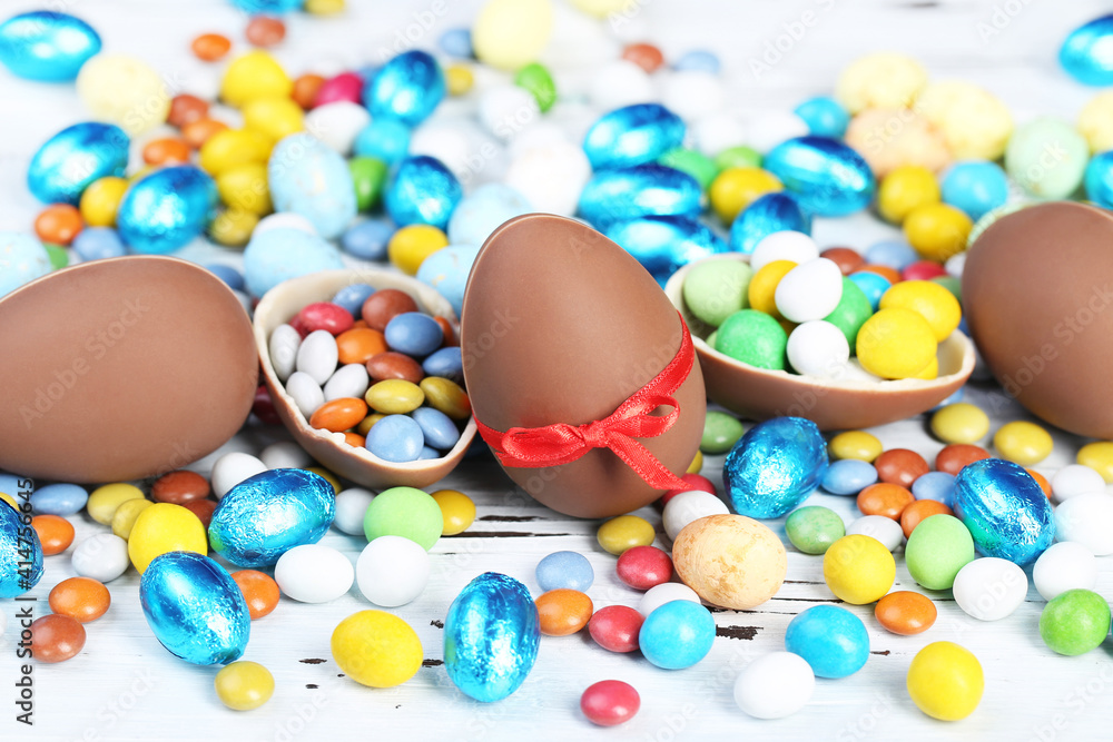 Easter chocolate eggs with candies on white wooden table