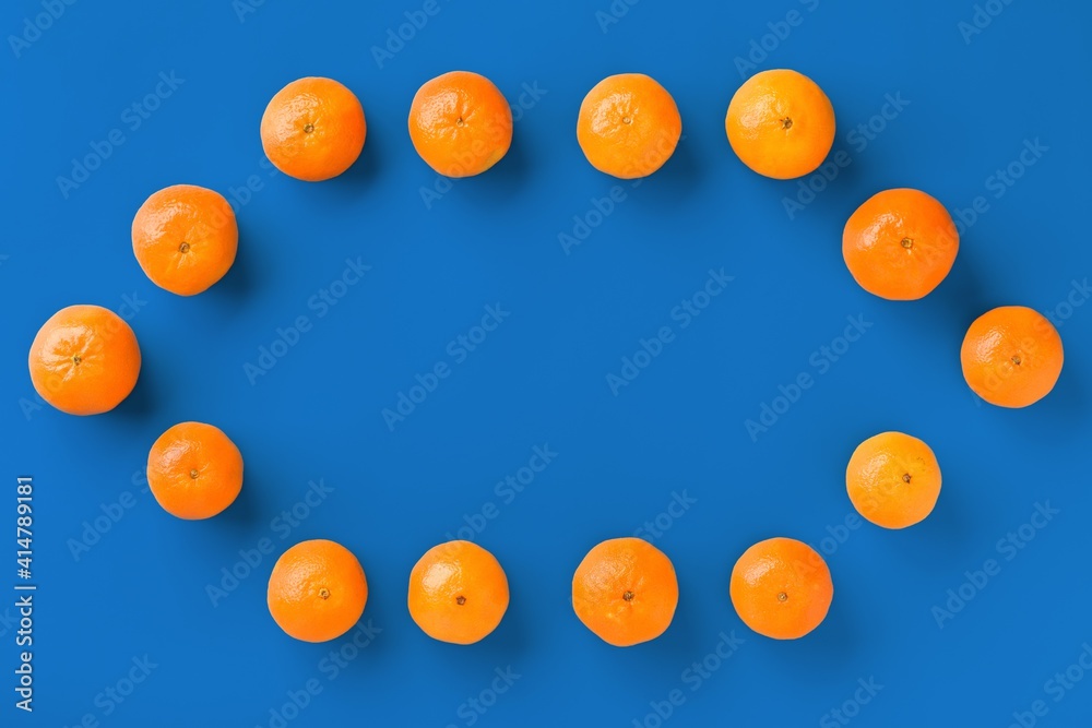 Fruit pattern of fresh orange tangerine or mandarin on lilac background. Flat lay, top view. Pop art design, creative summer concept. Citrus in minimal style.