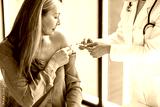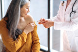 Vaccination and prevention of COVID19. Female hands of the doctor or nurse giving injection of vaccine to mature gray-haired patient at hospital. Injecting coronavirus remedy into middle aged woman