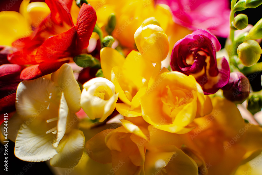 spring bouquet of fresh freesia flowers on black background