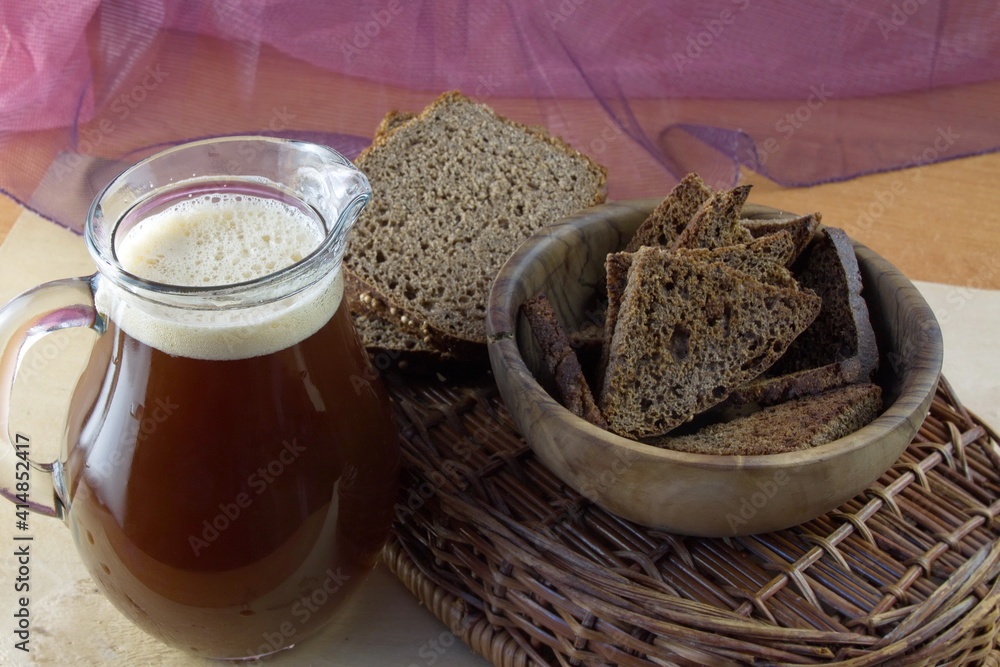 Bread kvass in a jug with a foam cap made of rye bread - a traditional Russian home-made drink