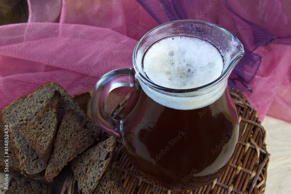 Bread kvass in a jug with a foam cap made of rye bread - a traditional Russian home-made drink