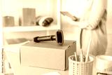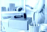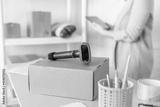 Woman employee of post office with tablet and barcode scanner for scanning parcel using to confirm sending customer. Home delivery service.