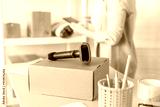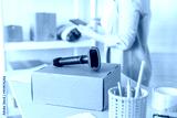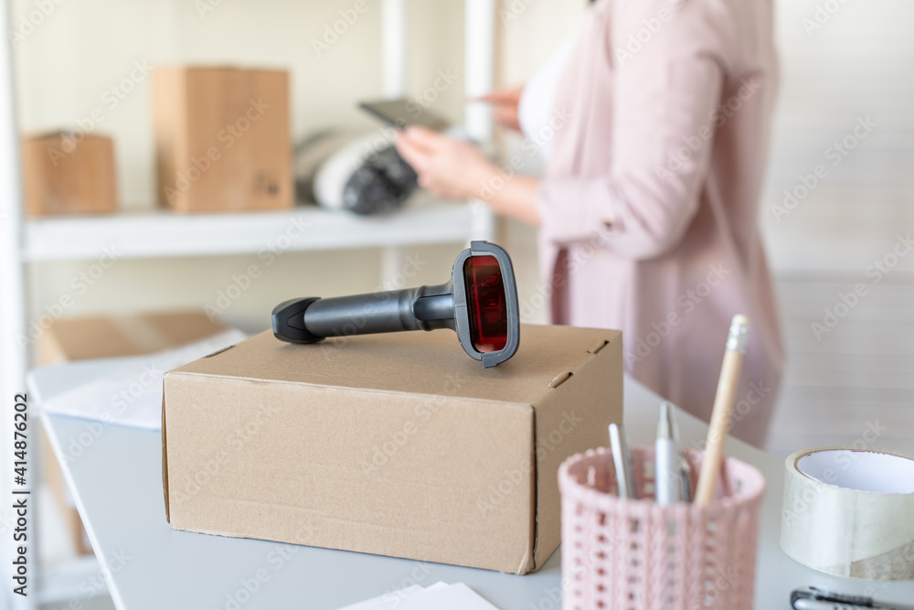 Woman employee of post office with tablet and barcode scanner for scanning parcel using to confirm sending customer. Home delivery service.