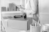 Woman employee of post office scanning parcel using barcode scanner to confirm sending customer. Home delivery service.