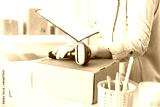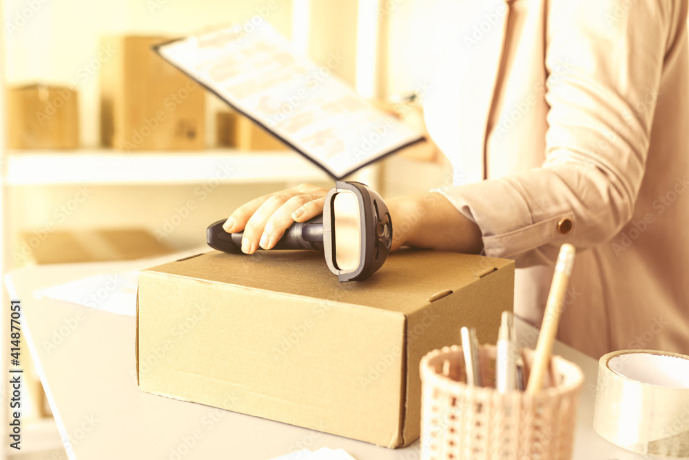 Woman employee of post office scanning parcel using barcode scanner to confirm sending customer. Home delivery service.