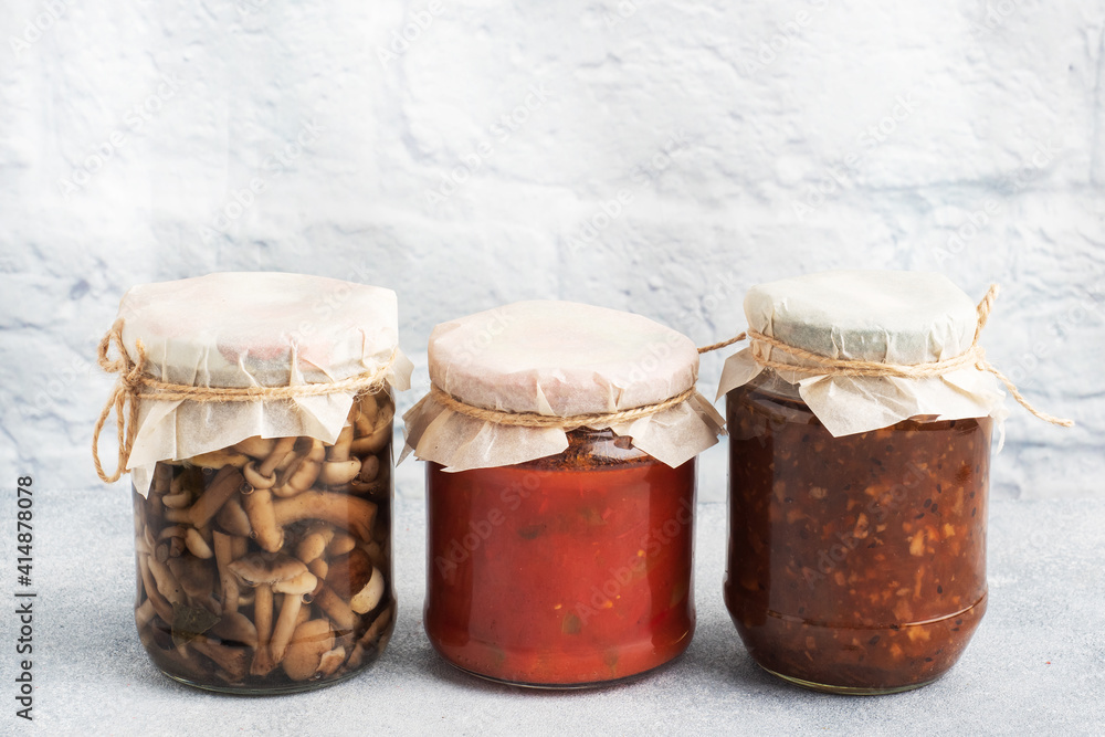 Preservation of vegetables in banks. Fermentation products. Harvesting tomatoes and berries, mushrooms for the winter. Copy space.