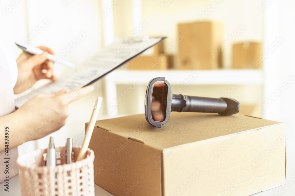 Female owner of start up small business with clipboard and barcode scanner in a small office. Warehouse worker.