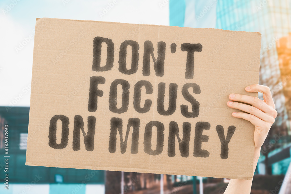 The phrase " Don't focus on money " on a banner in hand with blurred background. Goal. Target. Aspiration. Concentration. Wrong. Advice. Pursue money. Chasing