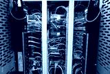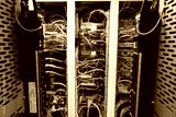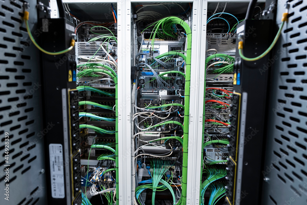 Close up view of internet equipment and cables in the server room. Broadcast system room.
