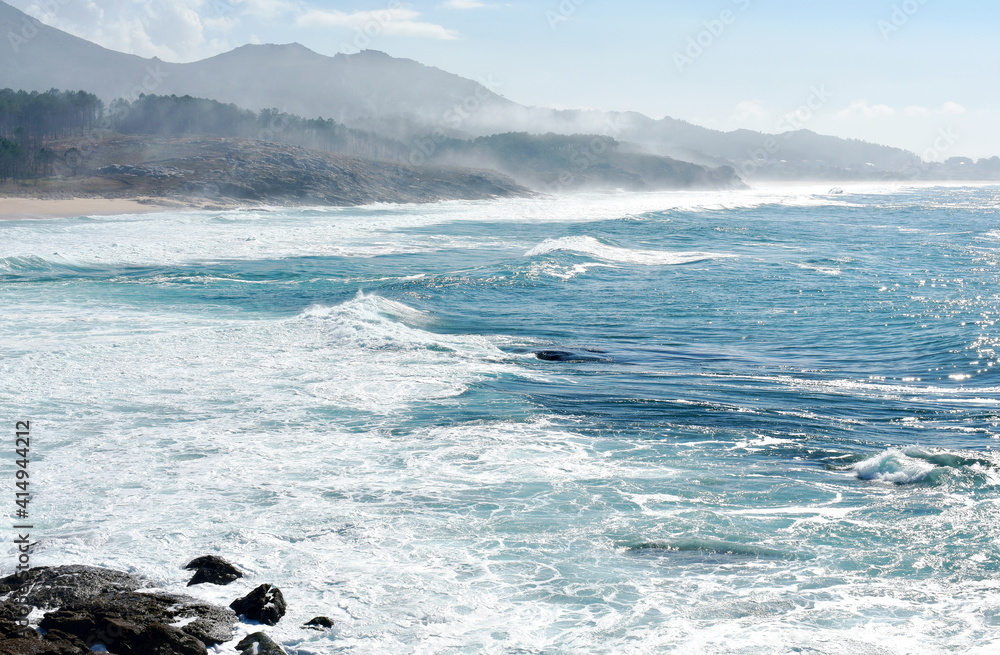 View from a cliff with waves breaking at famous Rias Baixas in Galicia Region. Porto do Son, Coruña, Spain.